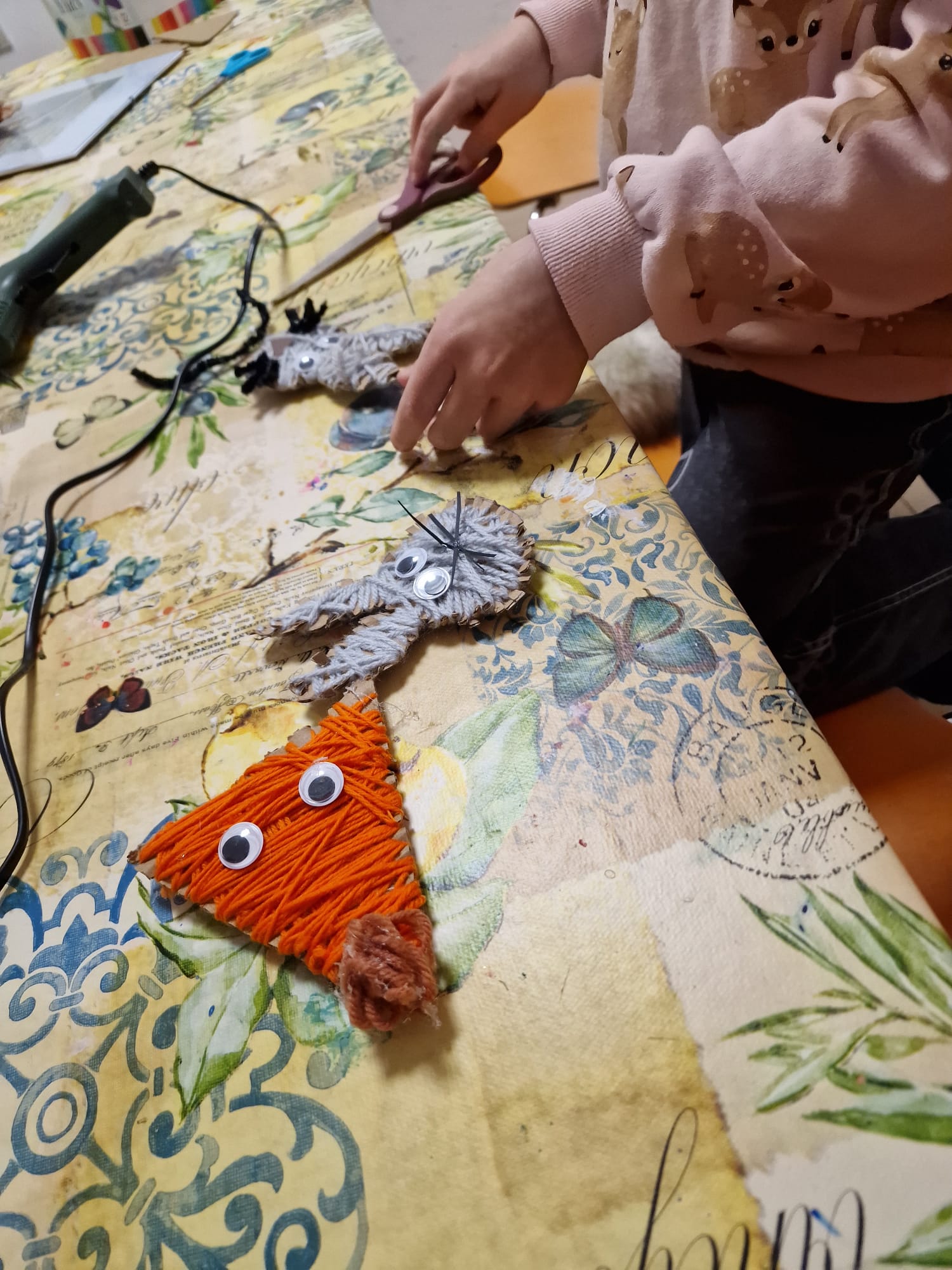 Po części wprowadzającej przyszedł czas na działania plastyczne. Dzieci z dużym zaangażowaniem przystąpiły do pracy twórczej, podczas której wykonały postacie leśnych zwierząt: lisa, dzika, jelenia oraz zająca. Prace powstały z wykorzystaniem włóczki i kartonu, co sprzyjało rozwijaniu kreatywności, wyobraźni oraz sprawności manualnej.
