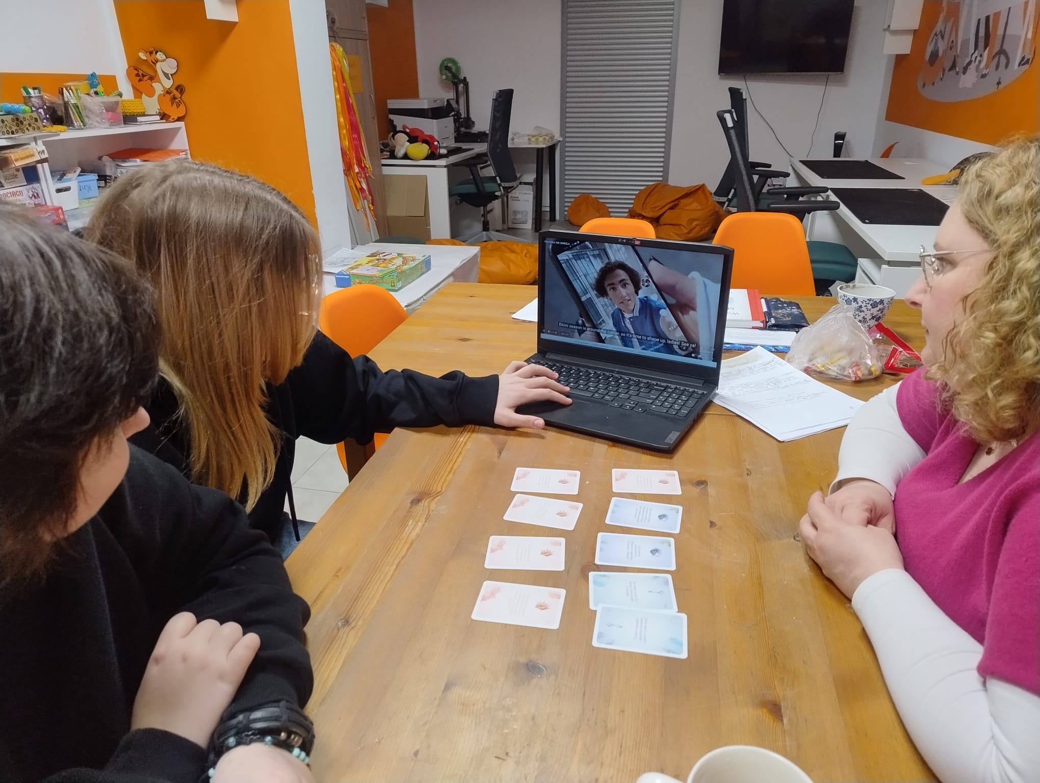 Pracowaliśmy w małej, kameralnej grupie, co sprzyjało szczerej rozmowie i dobrej atmosferze. Wspólnie obejrzeliśmy spot: Ciało nie określa a następnie odbyła się dyskusja. W trakcie warsztatu korzystaliśmy także ze specjalnych kart edukacyjnych dla nastolatków, które pomogły oswoić temat i zachęciły do refleksji nad tematyką warsztatu.