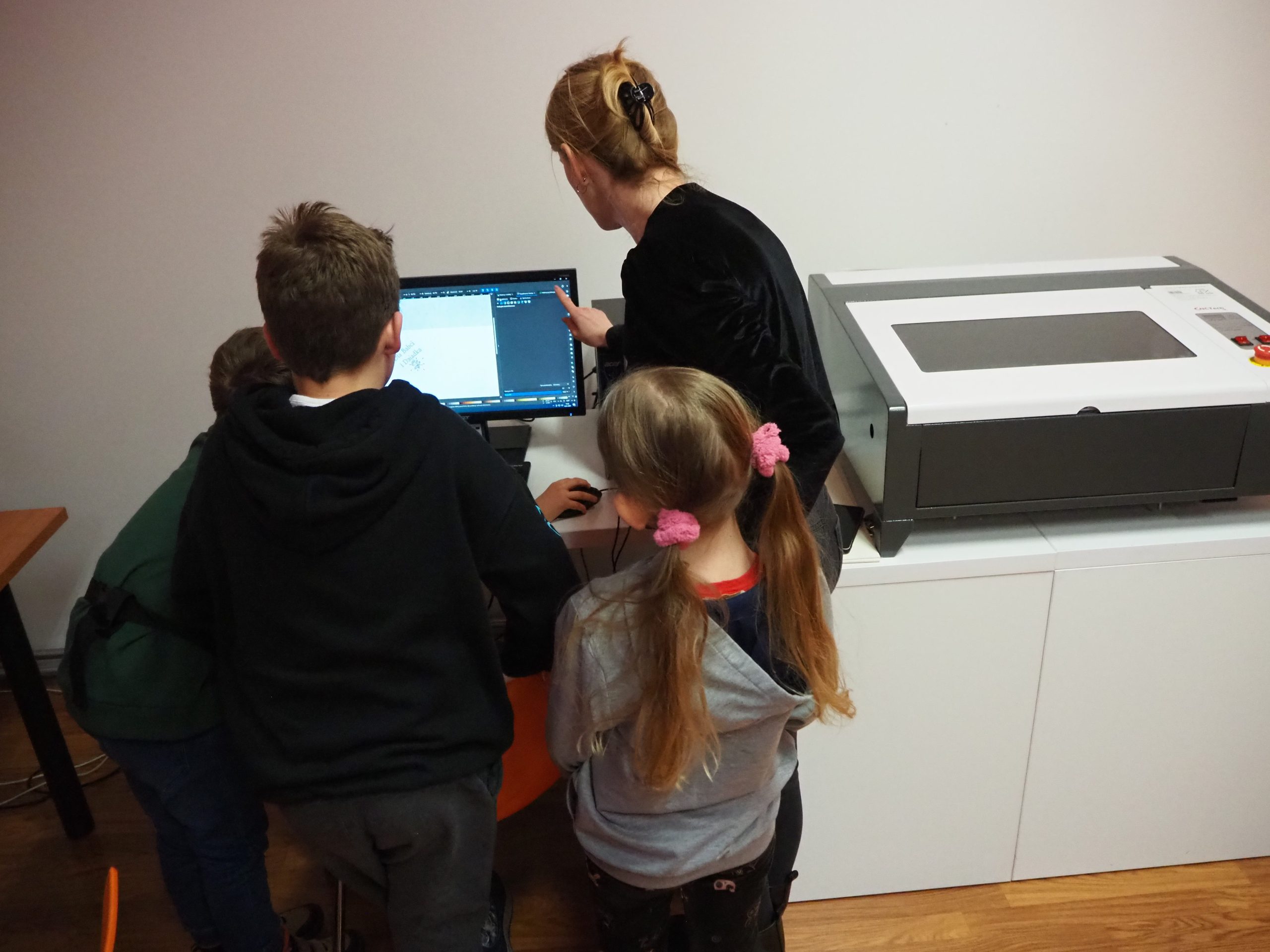 Ploter laserowy działa na pełnym obrotach. Drewniane serduszka stały się hitem kilku ostatnich zajęć Także w klubie laserodruku Makerspace uczestnicy tworzyli upominki na Dzień Babci i Dziadka. Była to dla nich doskonała lekcja cierpliwości i precyzji.