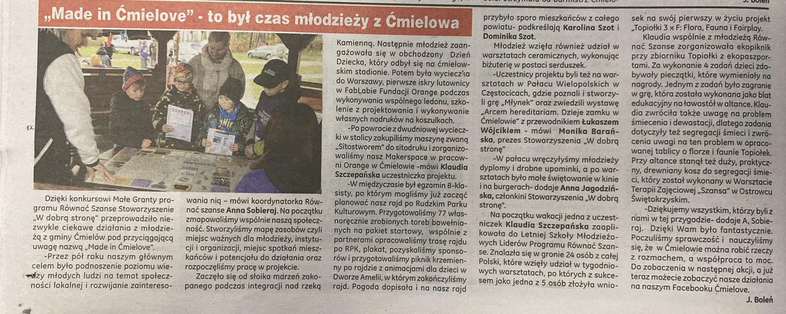 Stowarzyszenie W dobrą stronę w maju pozyskało dotację 12 000 w ramach konkursu Małe Granty programu Równać Szanse na działania z młodzieżą pt „Made in Ćmielove”z gminy Ćmielów.