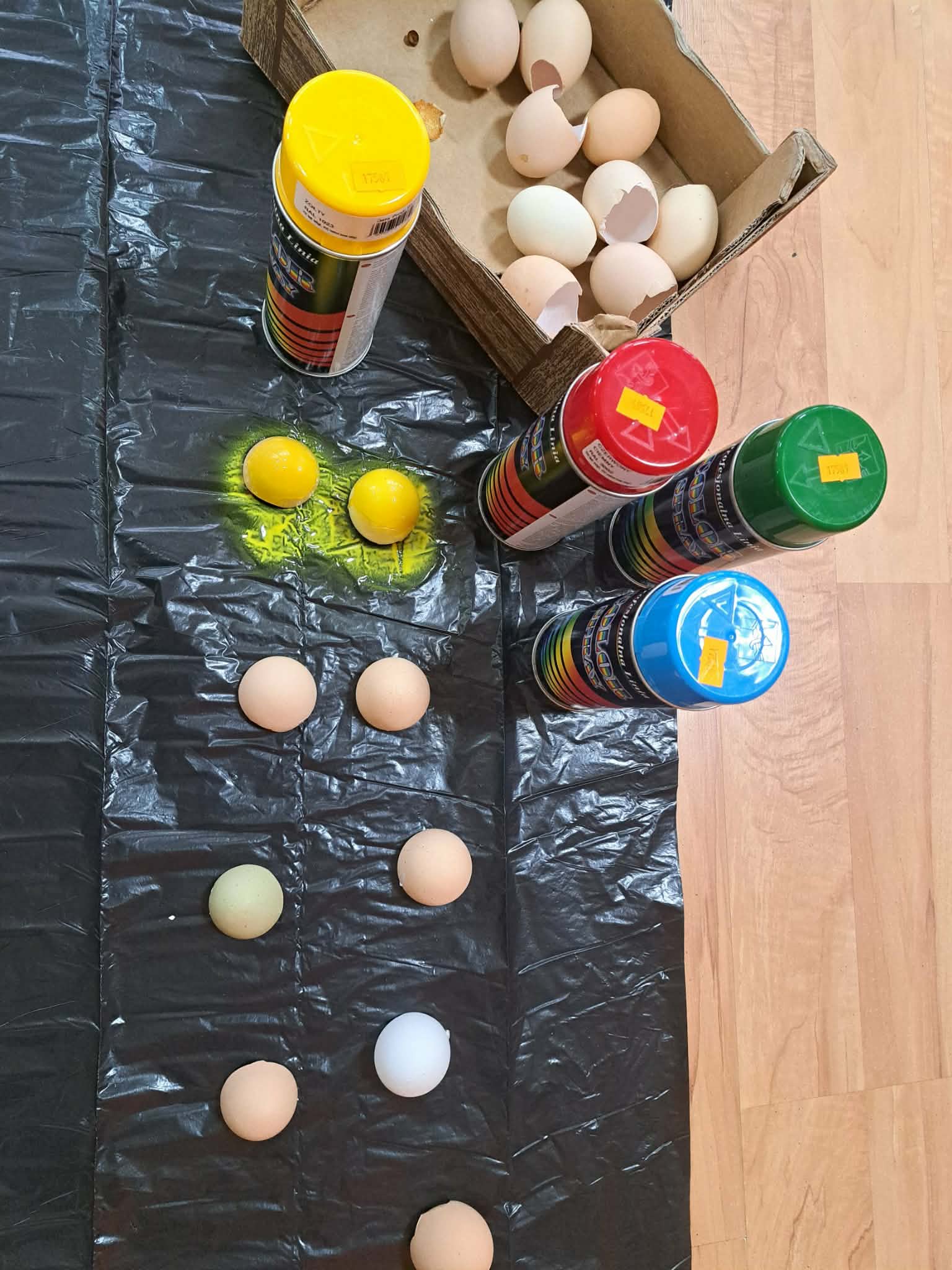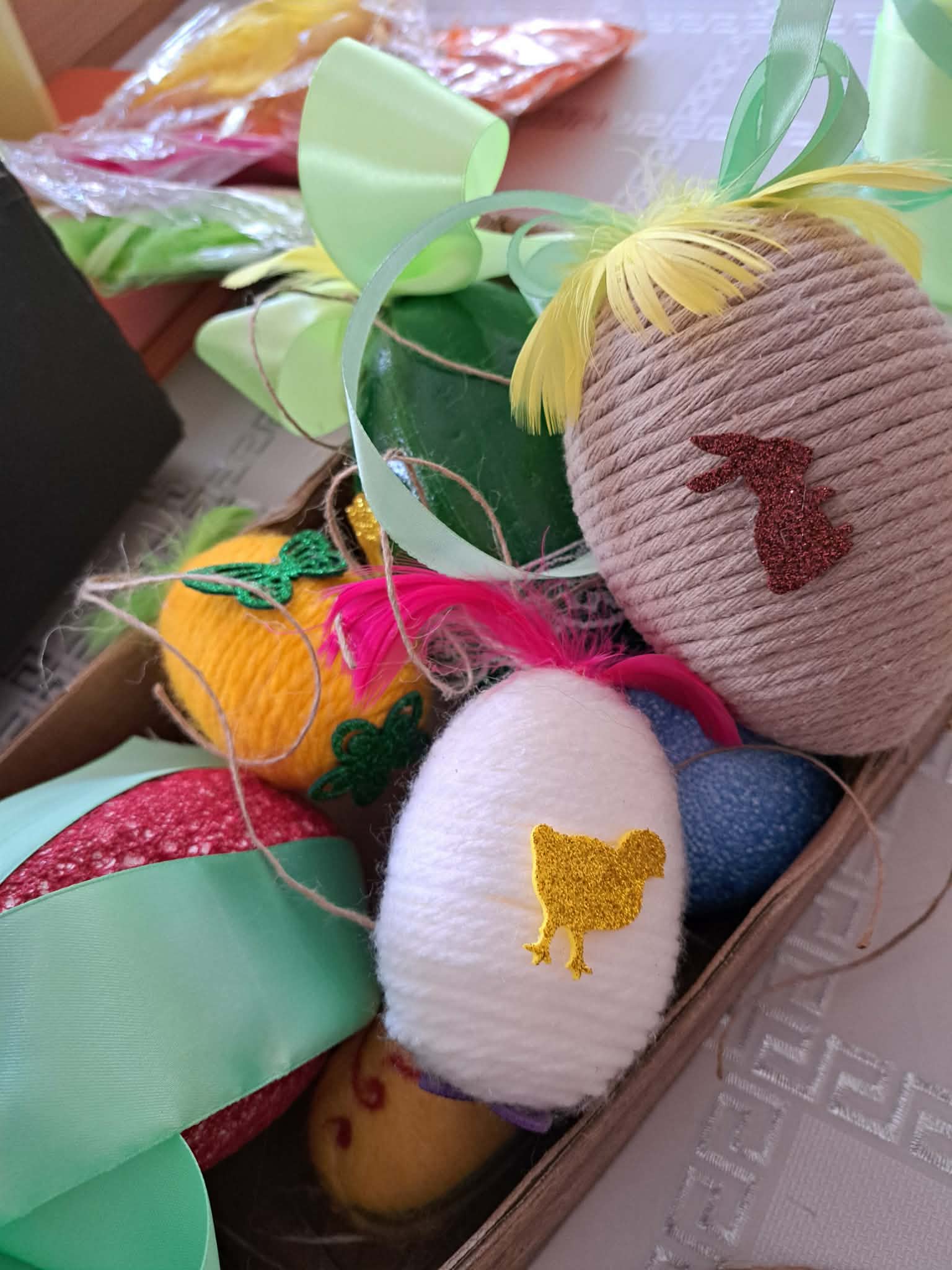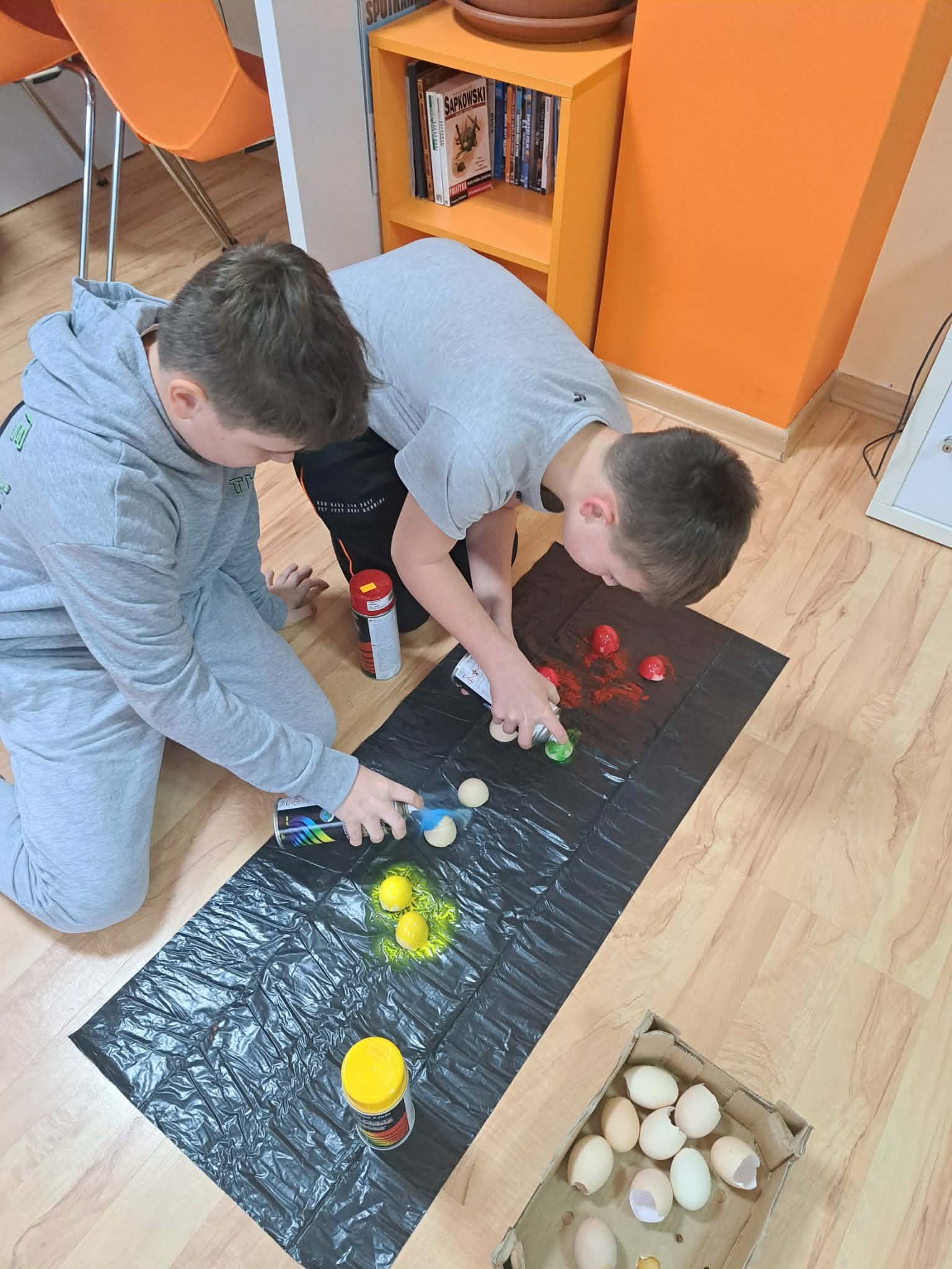 Kolejnym etapem były działania praktyczne. Uczestnicy – szczególnie młodsza grupa – zaangażowali się w kreatywne warsztaty, podczas których malowali pisanki przy użyciu farb w sprayu (i nie tylko). Powstały barwne, oryginalne wzory, pokazujące jak tradycyjne zwyczaje można interpretować w nowoczesny sposób. Efekty ich pracy zostały później wykorzystane do dekoracji.